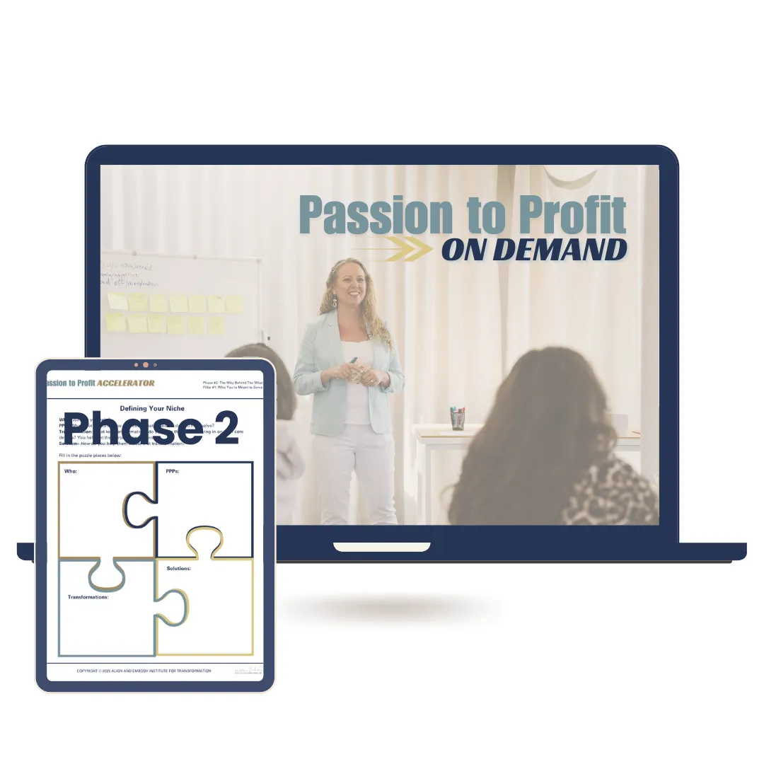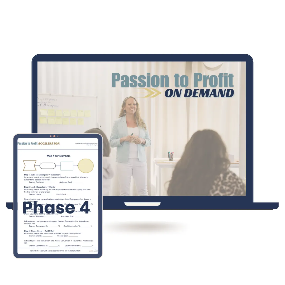 The Complete Passion to Profit On Demand Program (Value: $7,997)– Your A-to-Z blueprint, including 15 core pillars and 30+ lessons, to transform you from a burnt-out practitioner into the thriving CEO of your own freedom-based business.