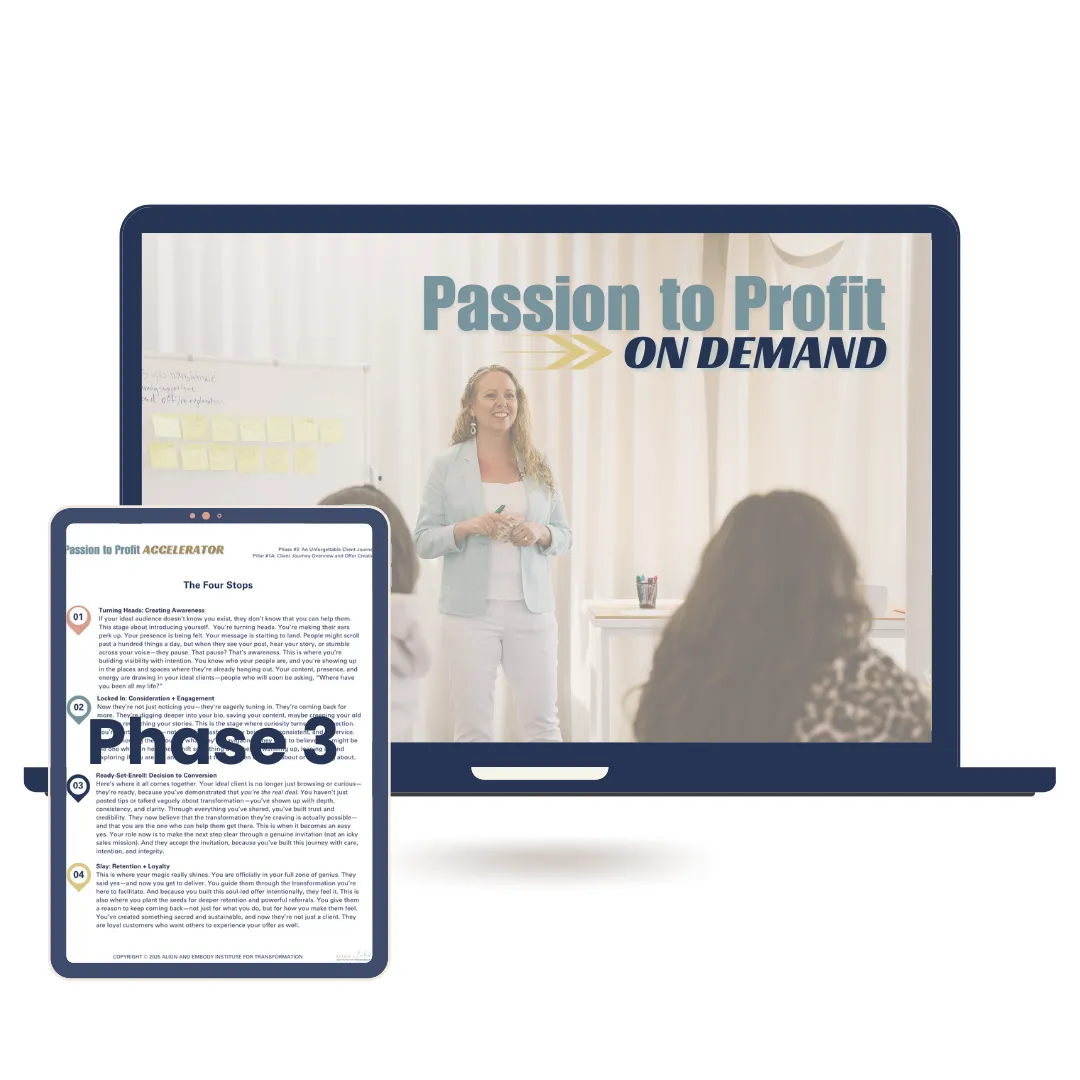 A thriving business isn’t built on one-time sales—it’s built on experiences that keep clients coming back and raving about you. In this phase, we’ll build out every step of your client journey, from the first moment someone finds you all the way to delivering extraordinary service. You won’t just learn about the steps—you’ll put them into action, including creating your one-of-a-kind, soul-aligned core offer that becomes the centerpiece of your business.