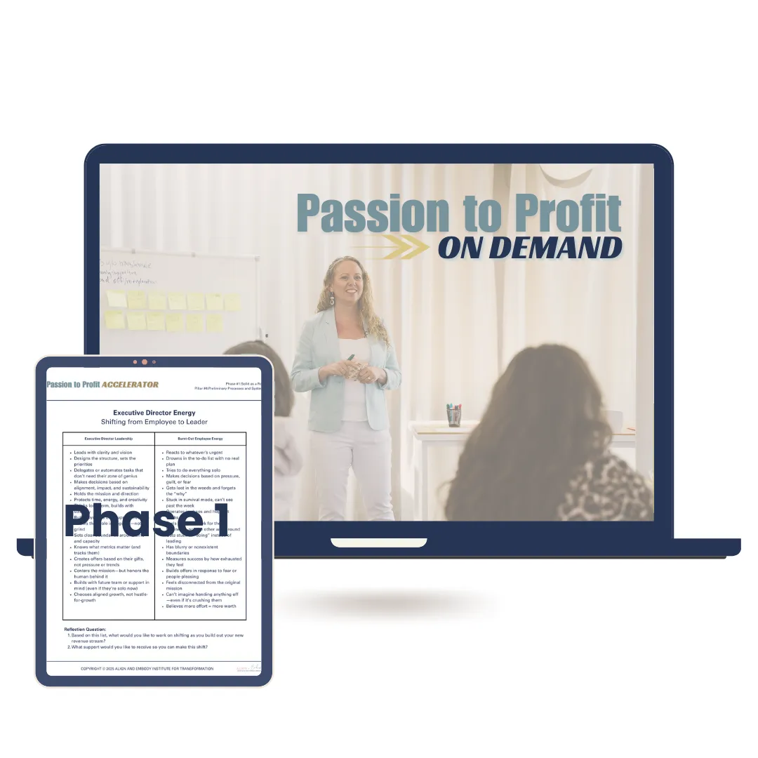 This is where your business shifts from working to thriving. In this phase, you’ll refine what’s already successful, streamline your systems, and set up strategies that free your time and energy. From there, we’ll explore expansion and new income streams that align with your mission, while guiding you to step fully into your role as a visionary leader. By the end, you’ll have the clarity and structure to keep your business profitable, sustainable, and deeply fulfilling for years to come.